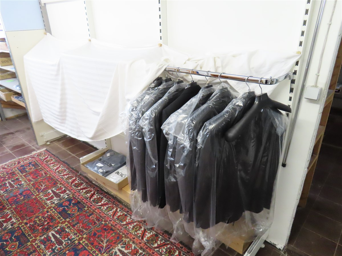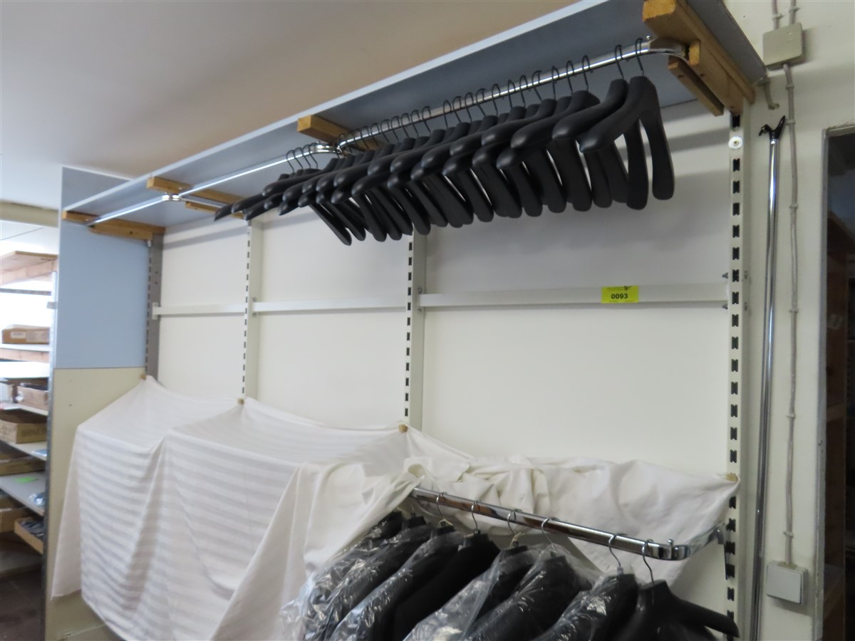 1 Wandregalsystem, modular, ca. 3,00 m x 2,40 m, mit 1 Einlegeboden sowie Aufhängewaren, weitere Komponenten vorhanden