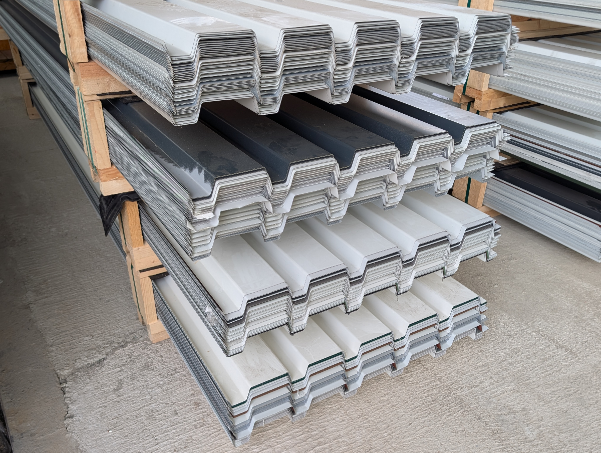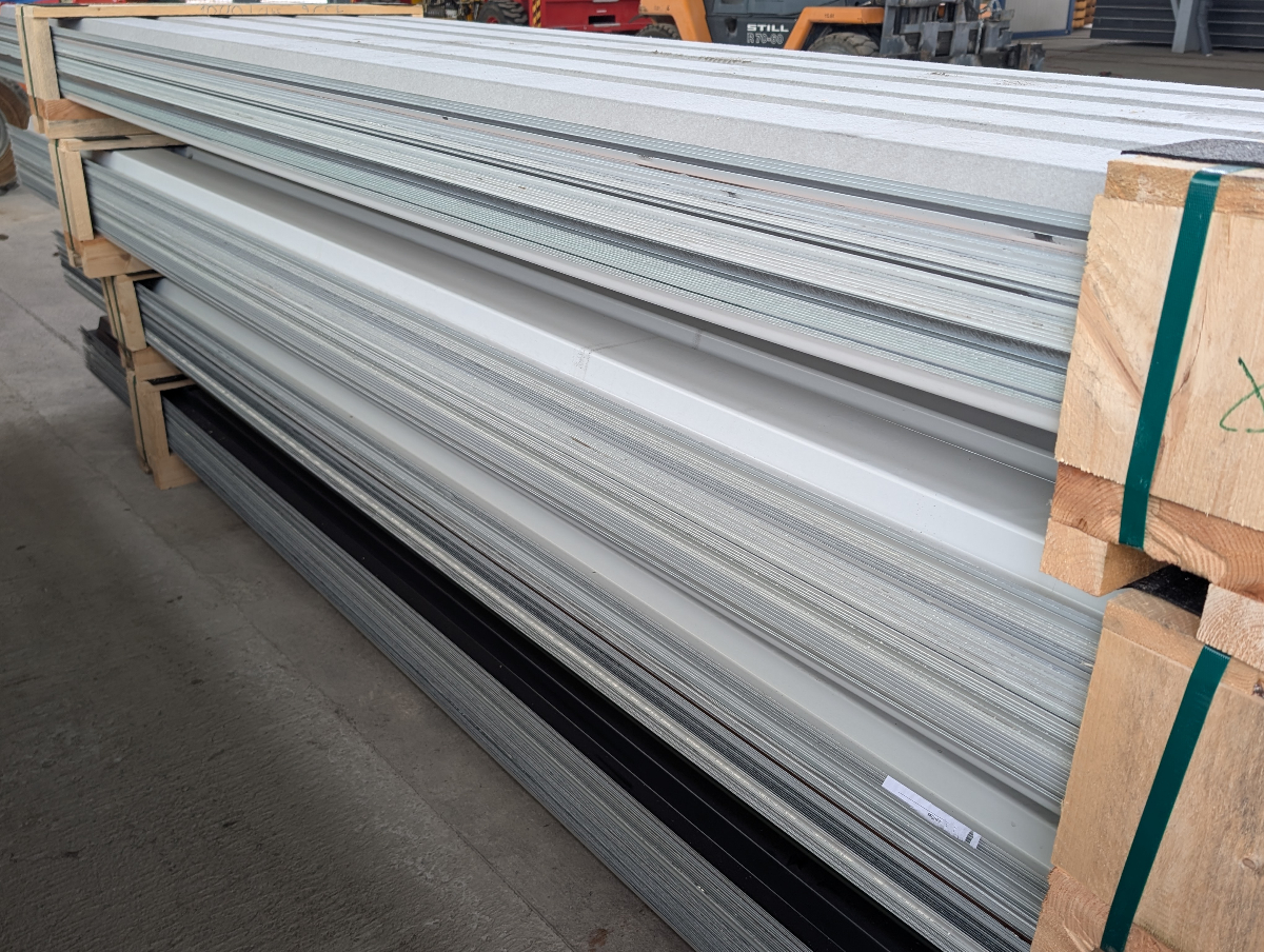 1 Posten Trapezbleche, 50 Stück, Länge: 450 cm, Profilhöhe: 40 mm, Deckbreite: 91,5 cm, Tafelbreite: 95,5 cm, 2. Wahl, farblich unsortiert, unterschiedliche Stärken von 0,63 bis 1,00 mm, Korrosionsschutz und Farbbeschichtung, beidseitig mit Aluzink, teilweise mit Vlies. - Kratzer, kleine Dellen und Transportspuren möglich