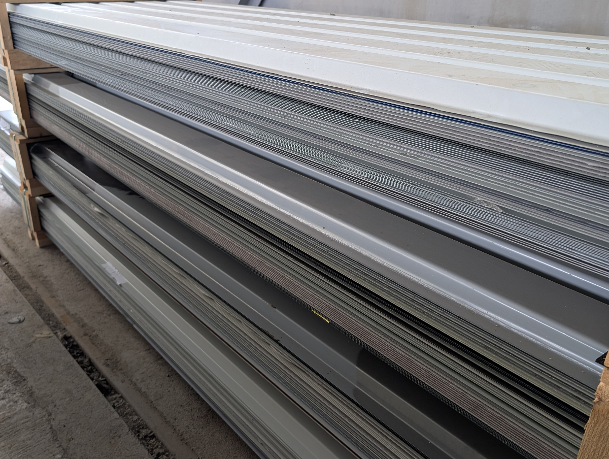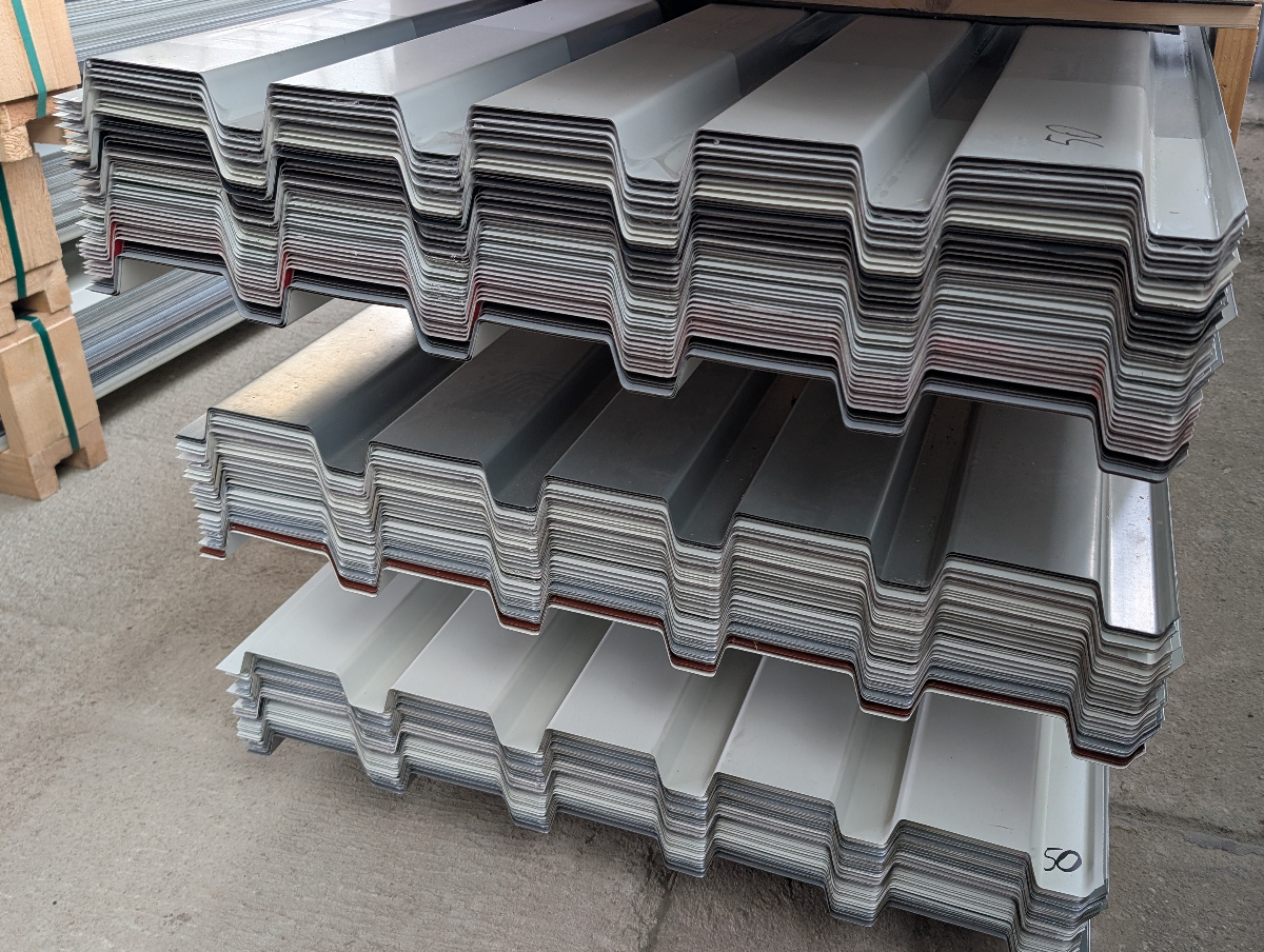 1 Posten Trapezbleche, 50 Stück, Länge: 450 cm, Profilhöhe: 40 mm, Deckbreite: 91,5 cm, Tafelbreite: 95,5 cm, 2. Wahl, farblich unsortiert, unterschiedliche Stärken von 0,63 bis 1,00 mm, Korrosionsschutz und Farbbeschichtung, beidseitig mit Aluzink, teilweise mit Vlies. - Kratzer, kleine Dellen und Transportspuren möglich