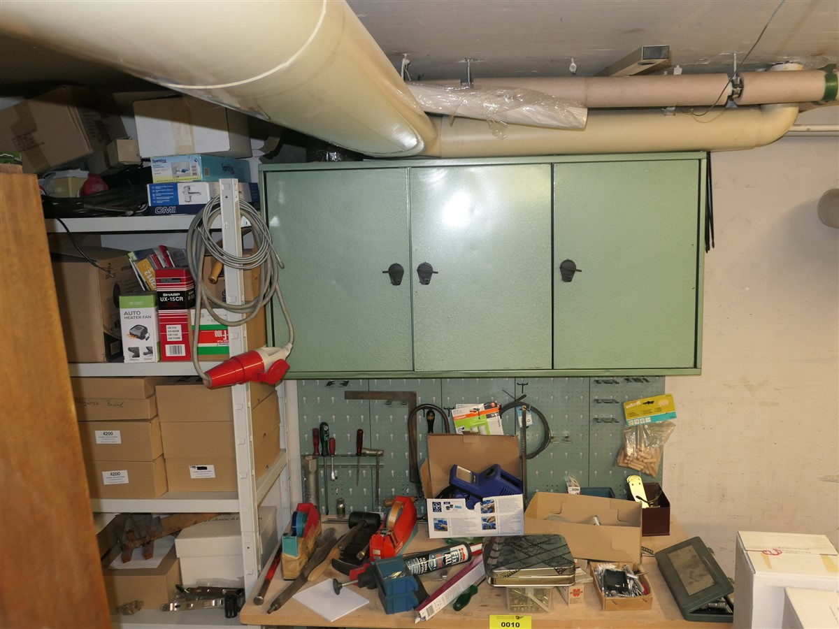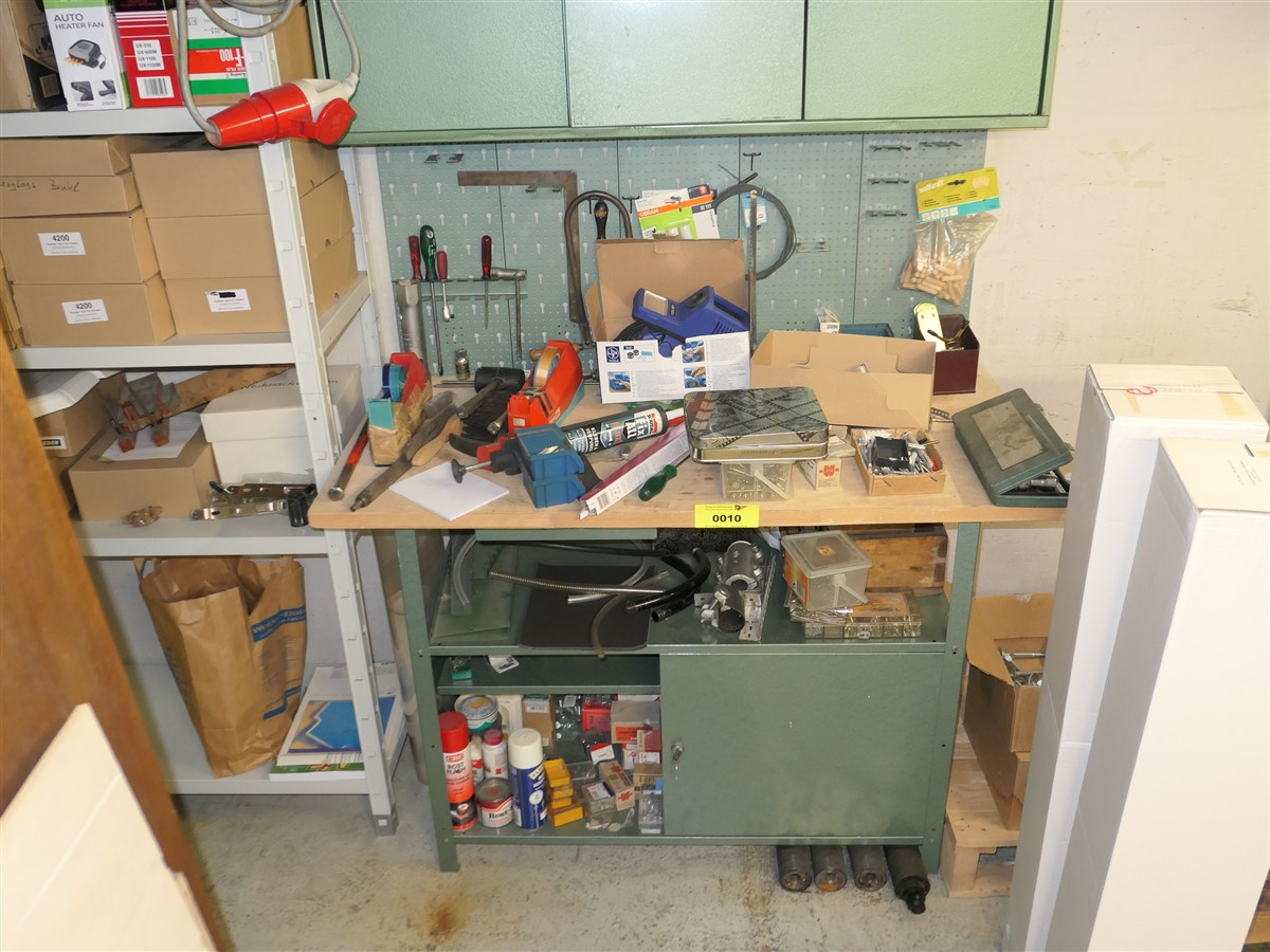 1 Werkbank, Arbeitsfläche Holz, Gestell Metall grün, sowie HÃängeschränke, Metall grün
