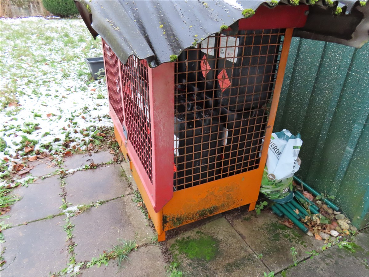 1 Gitterbox, verschließbar, mit Auffangwanne, genutzt als Gefahrstofflager, Inhalt: Leerkanister