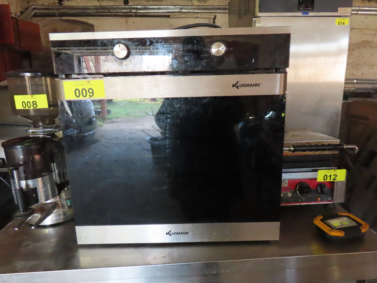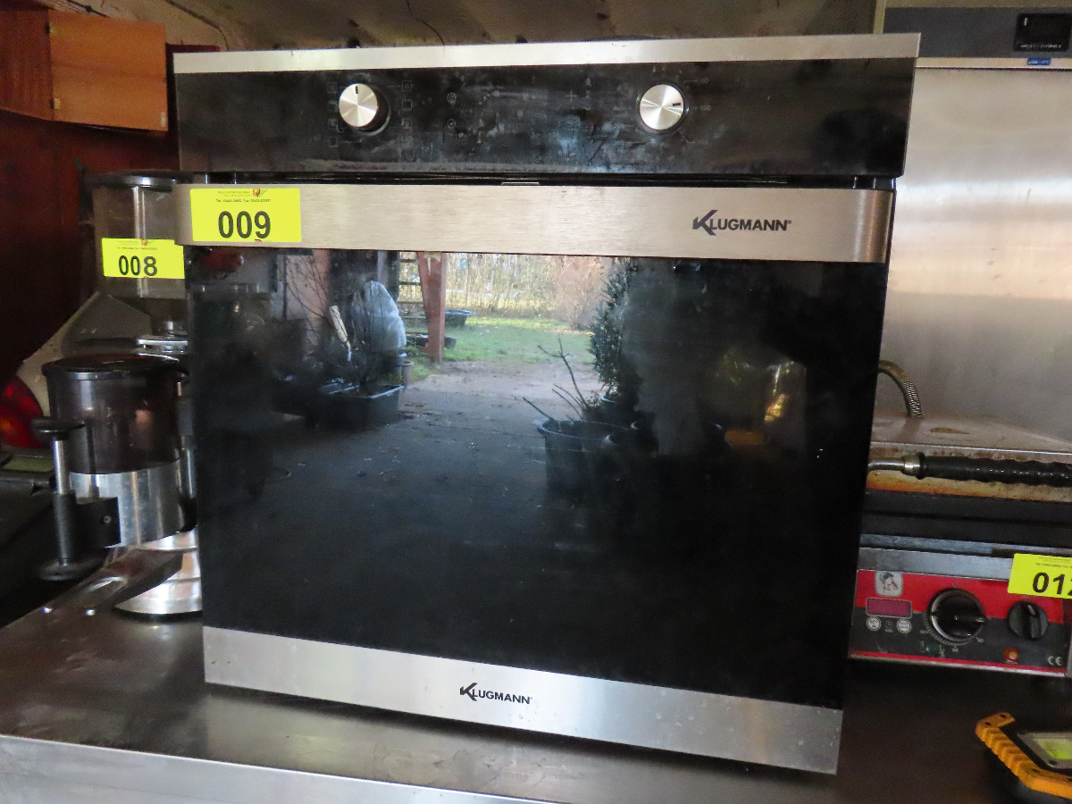 1 Einbaubackofen, Fabr. Klugmann, Typ nicht erkennbar, Teleskopauszug, 3-fach Verglasung, 3D-Heißluft und Grill-/Brat-System, versenkbare Bedienfunktion
