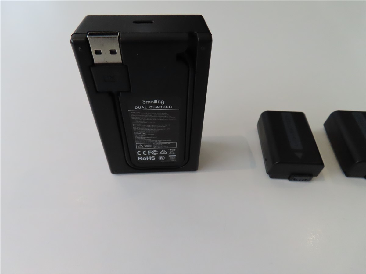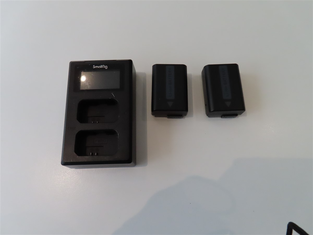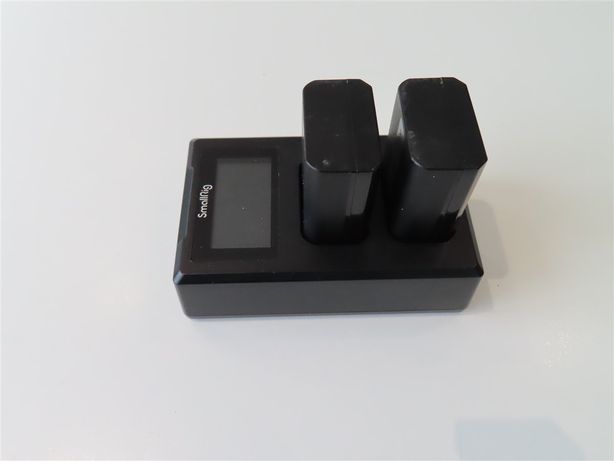 1 Ladegerät, Fabr. SmallRig, Typ Dual Charger (CP001), mit Ladestandsanzeige, mit 2 Akkus Fabr. SmallRig, Typ BC001, Kapazität 1030 mAh, entsprechen Sony Standard NP-FW50