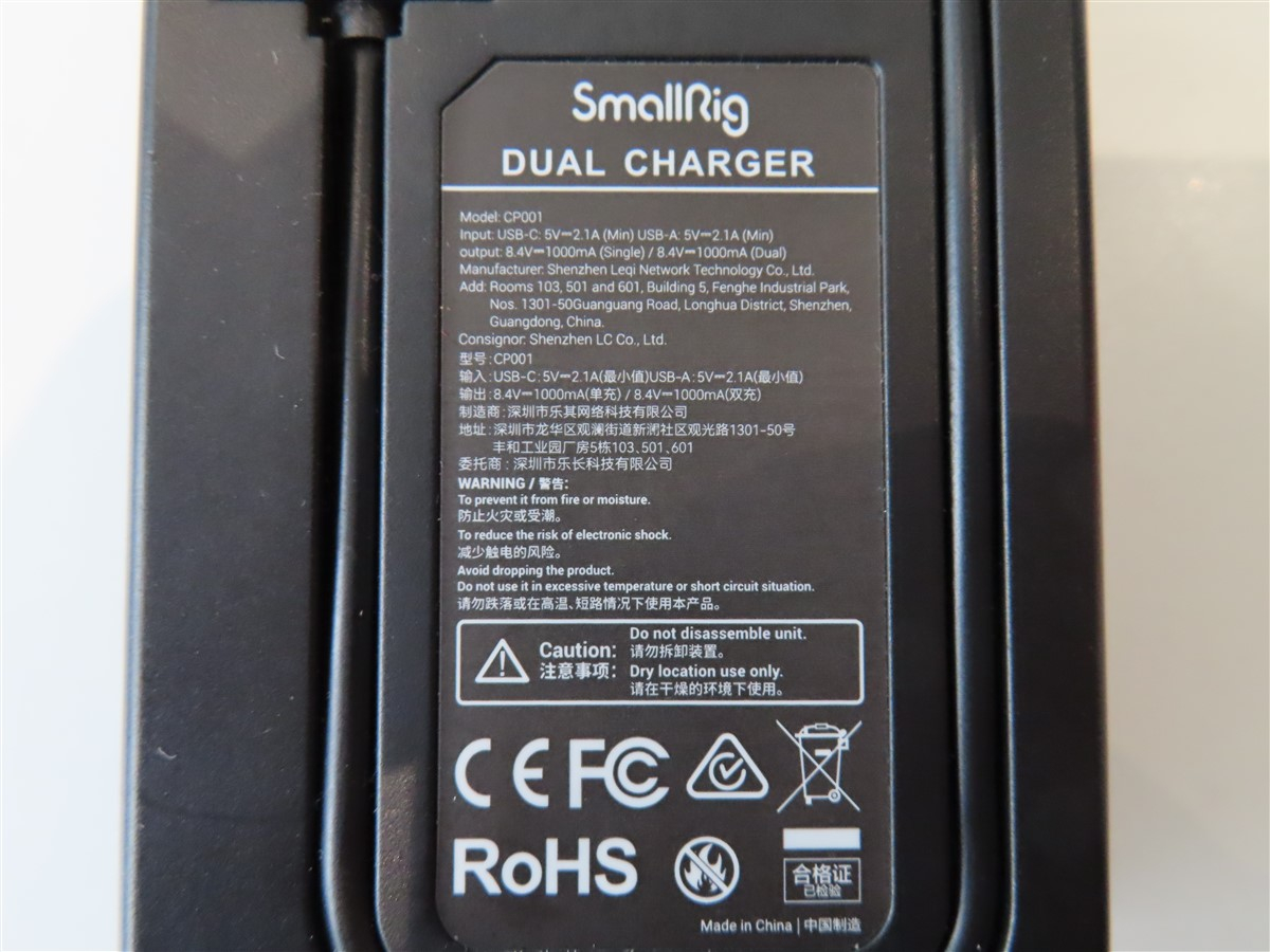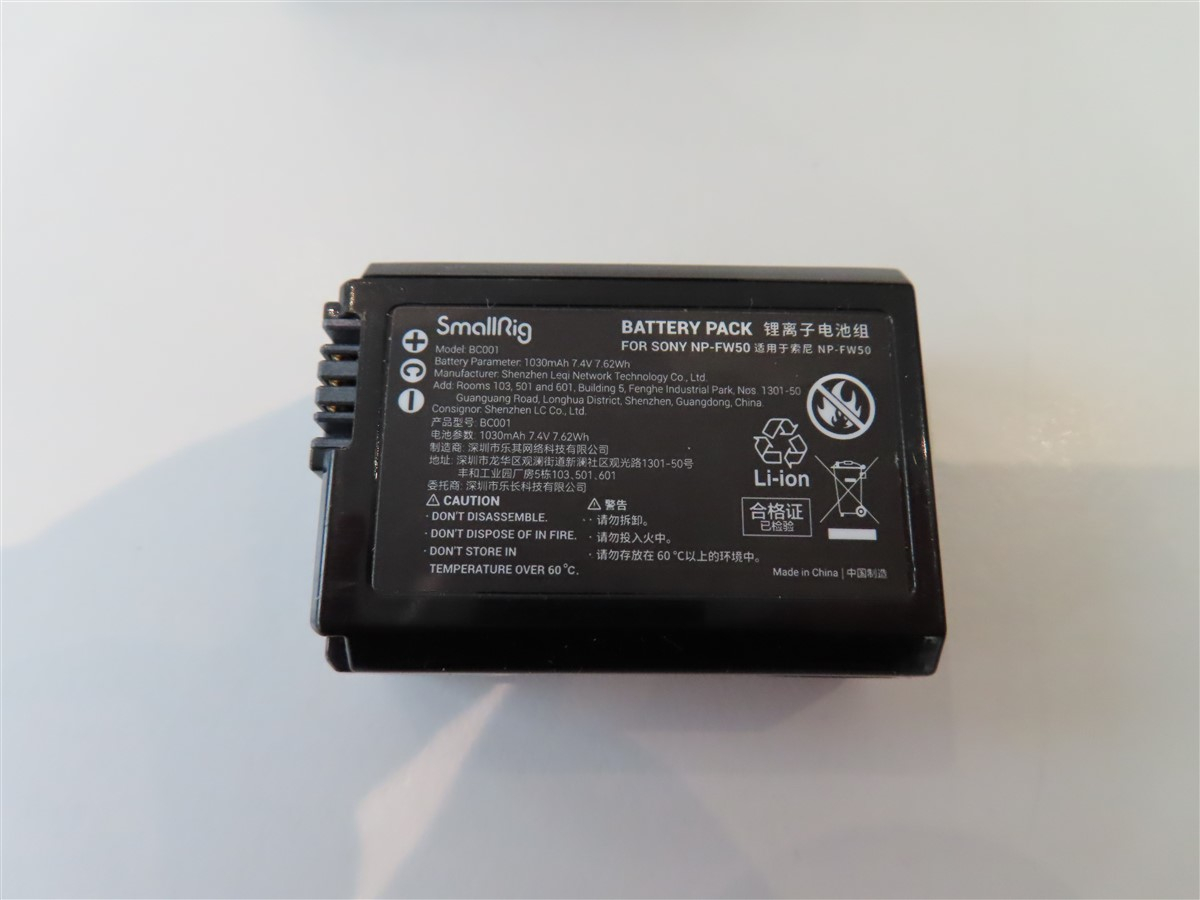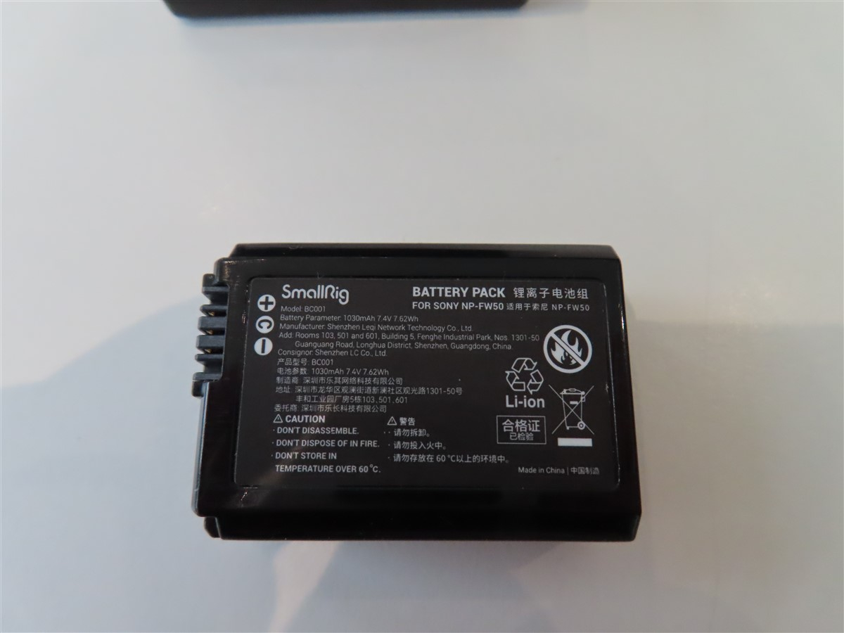 1 Ladegerät, Fabr. SmallRig, Typ Dual Charger (CP001), mit Ladestandsanzeige, mit 2 Akkus Fabr. SmallRig, Typ BC001, Kapazität 1030 mAh, entsprechen Sony Standard NP-FW50