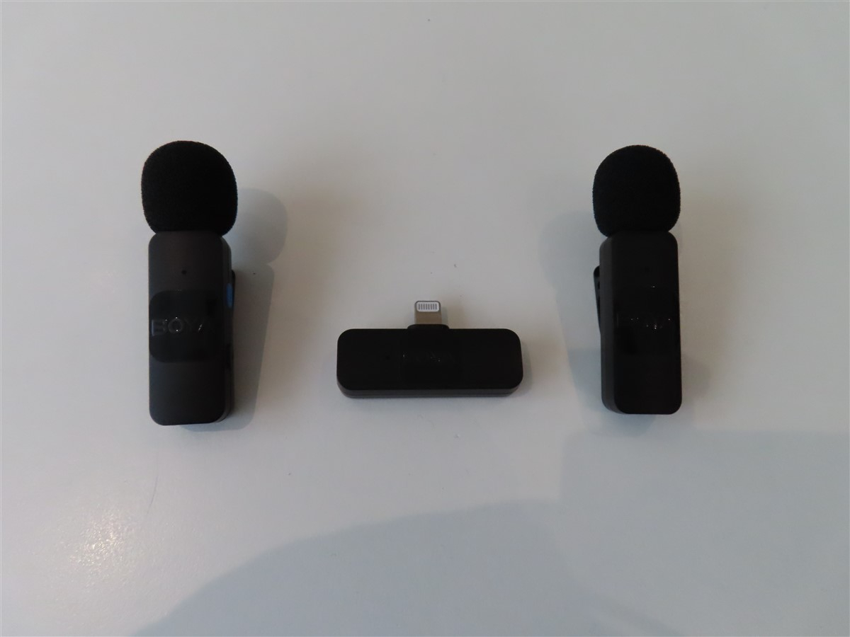 1 Mikrofonsystem, Fabr. BOYA, Typ BY-V2, bestehend aus 2 Sendern (Ansteckmikrofon) und Empfänger optimiert für Apple iOS-Geräte (Lightning-Anschluss)
