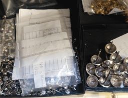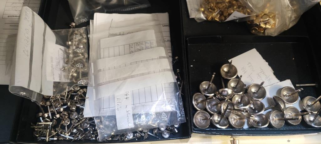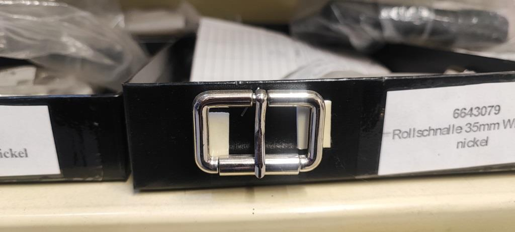 1 Posten Lagerbestand einer Lederwarenmanufaktur, u.a. Nähgarn, Scharniere, Schnallen, Bodennägel, Druckknöpfe, Ketten, Karabinerhaken, Schlüsselringe, Druckknöpfe, Klebebänder, Lederfaserstoff, Futterstoffe, Umschlagkartons, etc., gemäß Lagerbestandsliste vom 12.12.2025
