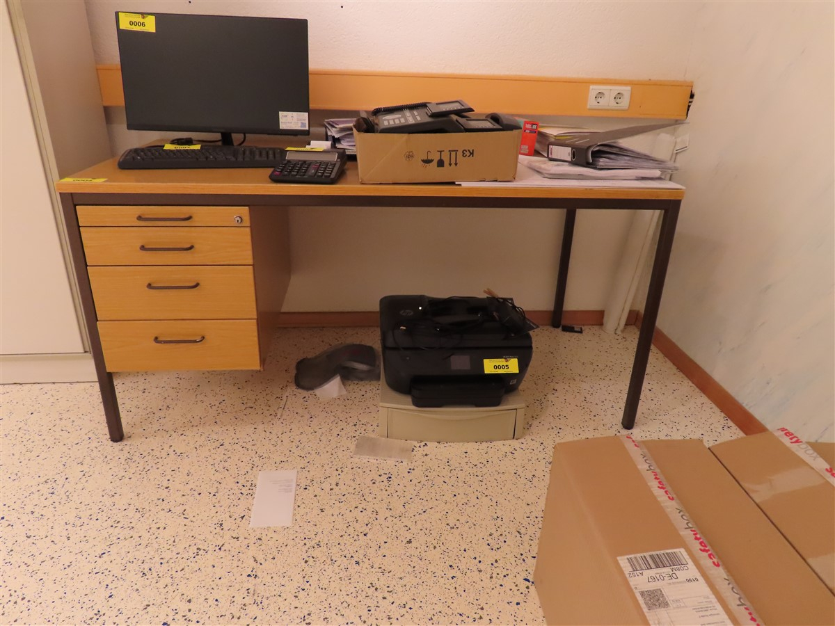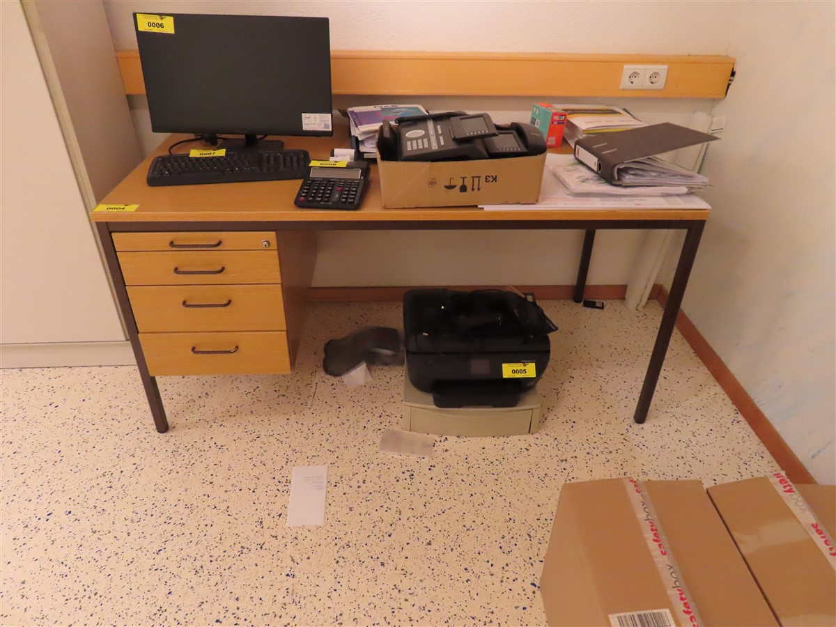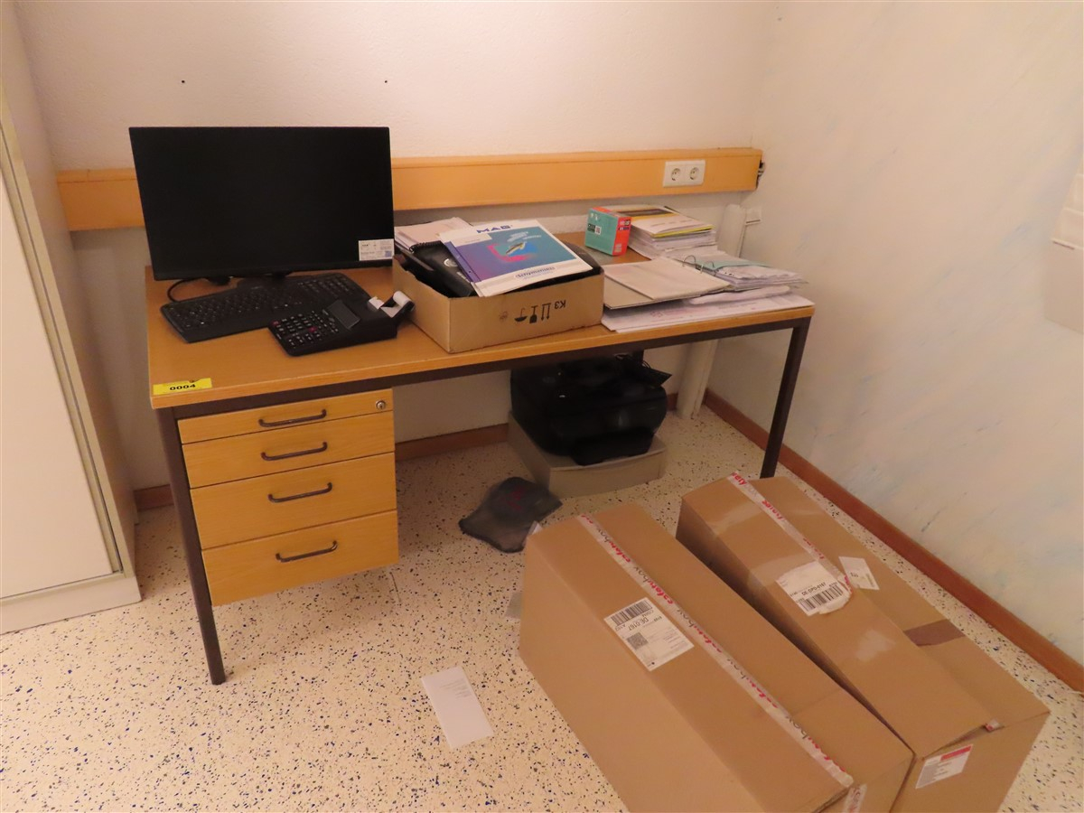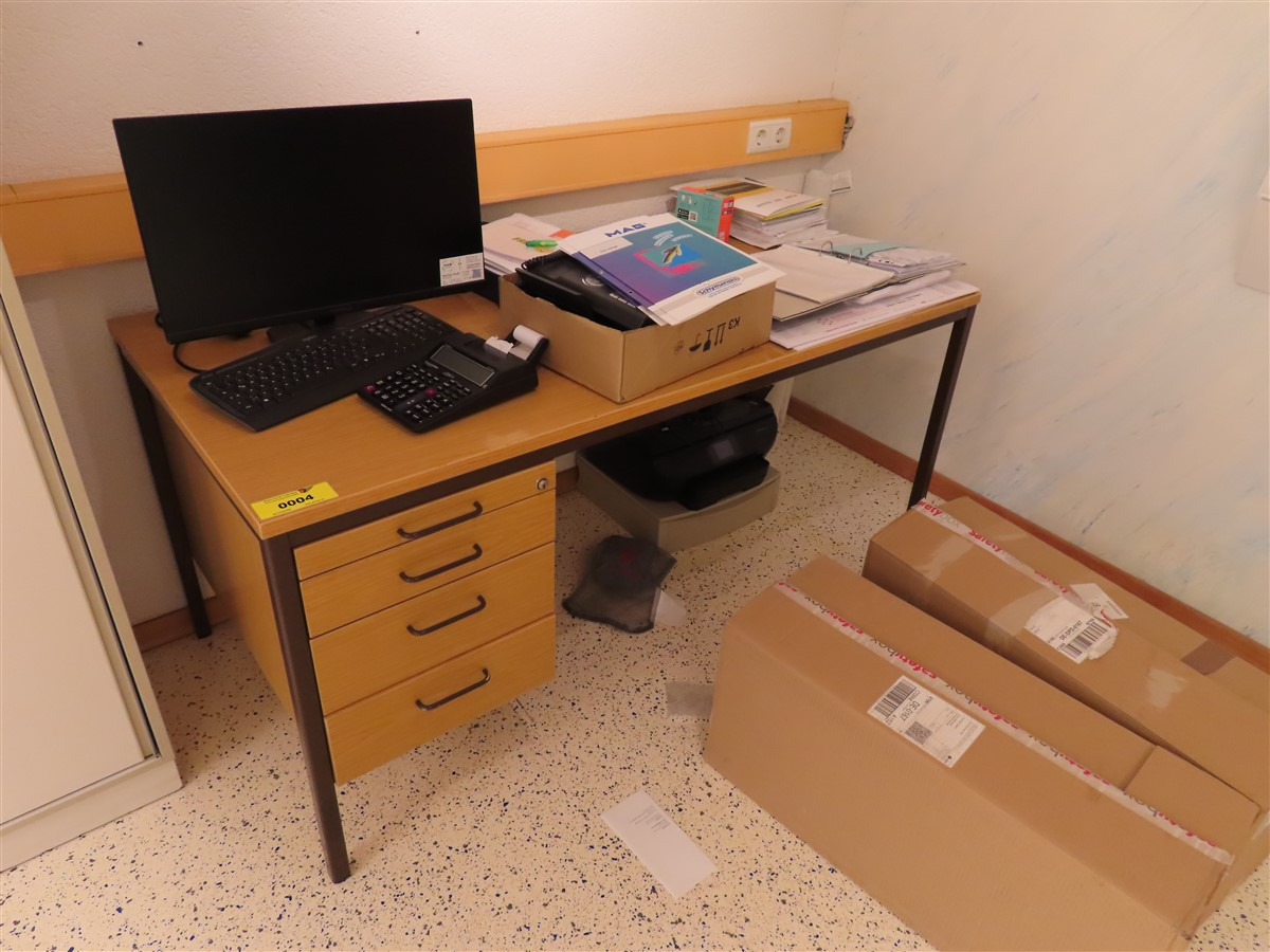 1 Schreibtisch, holzoptik, braun, ältere Ausführung mit integrierten Bürocontainer