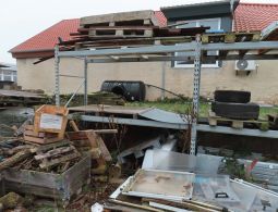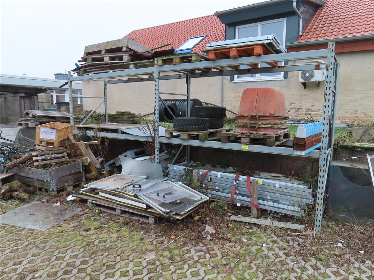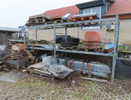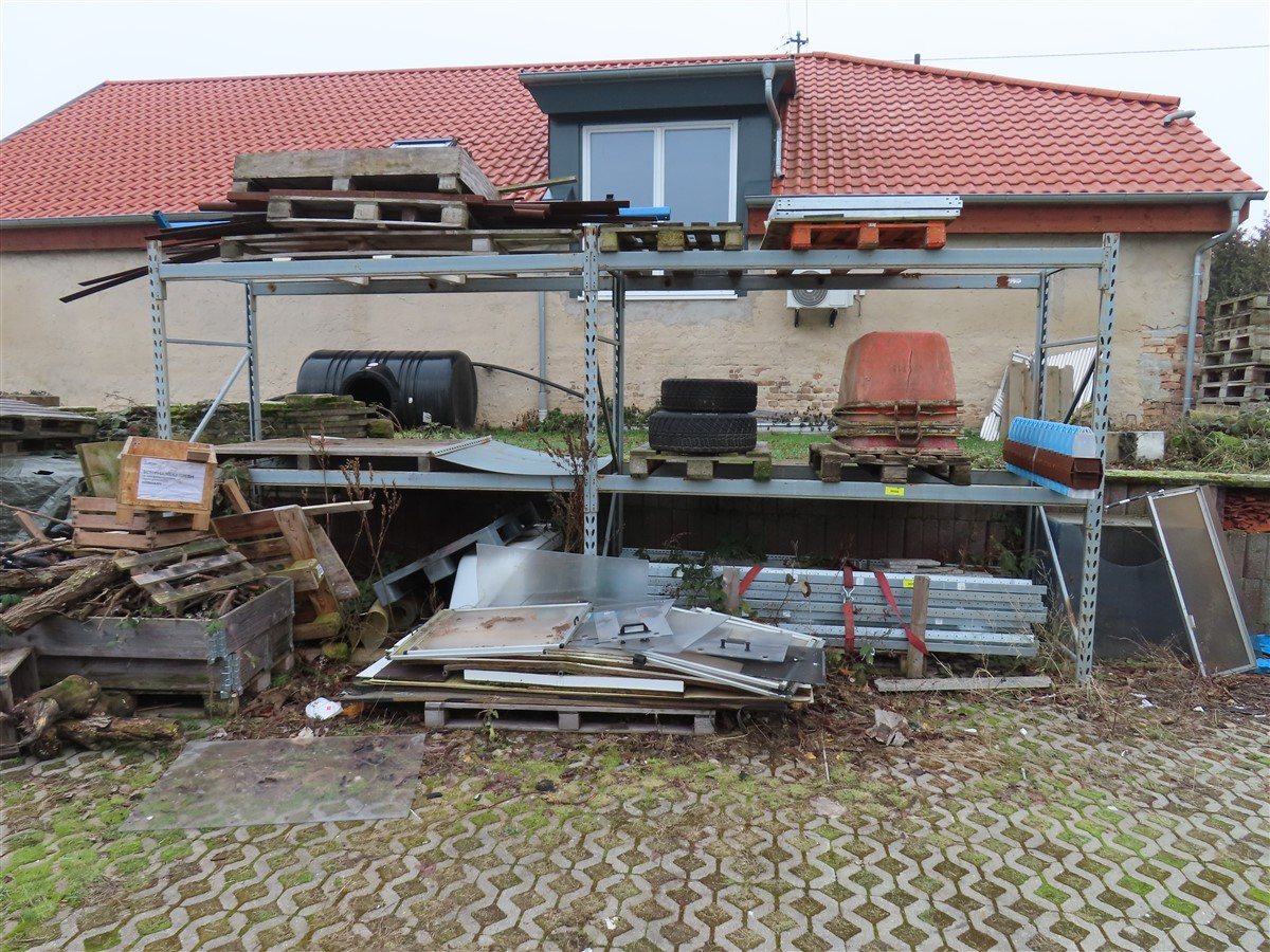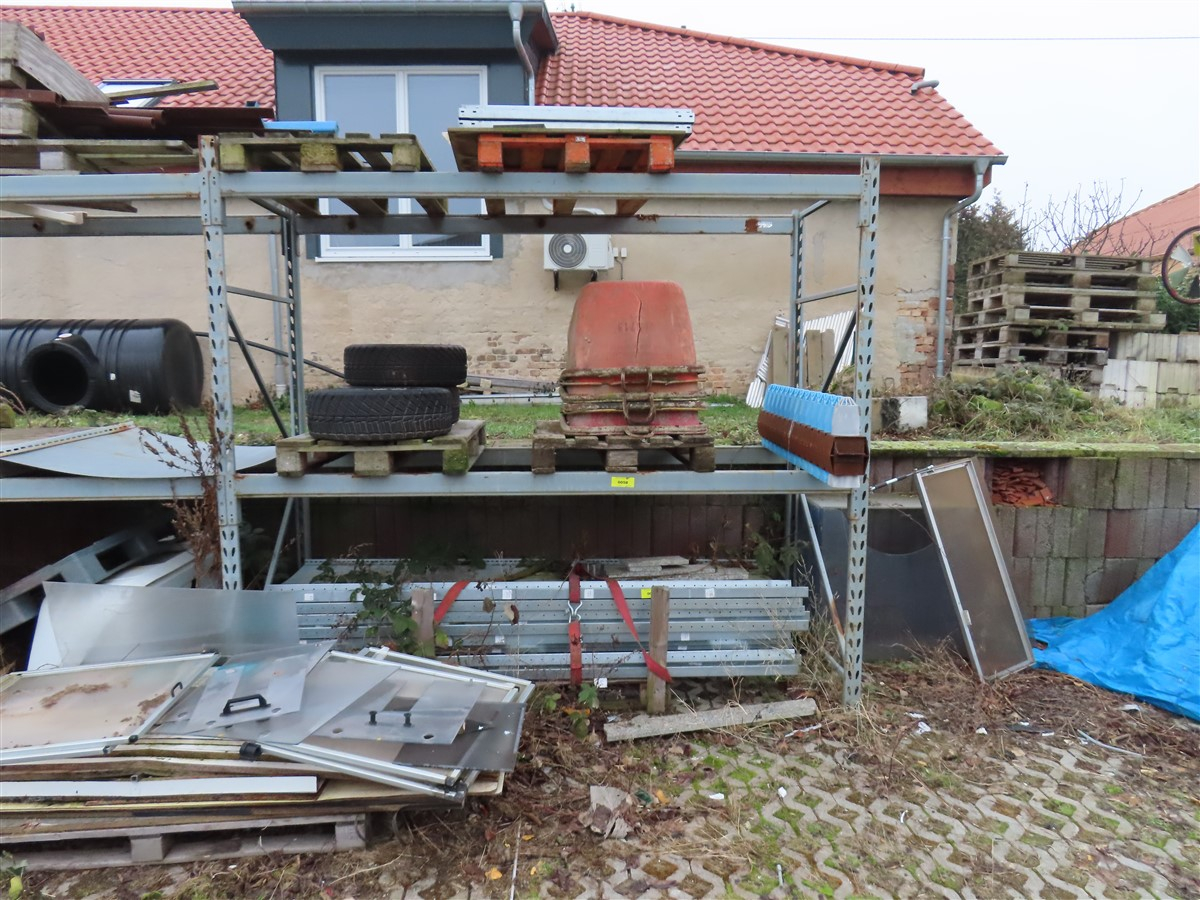 1 Palettenregal, bestehend aus 3 Ständer, 4 Querträgertraversenpaare, 3 Ständer Ersatz