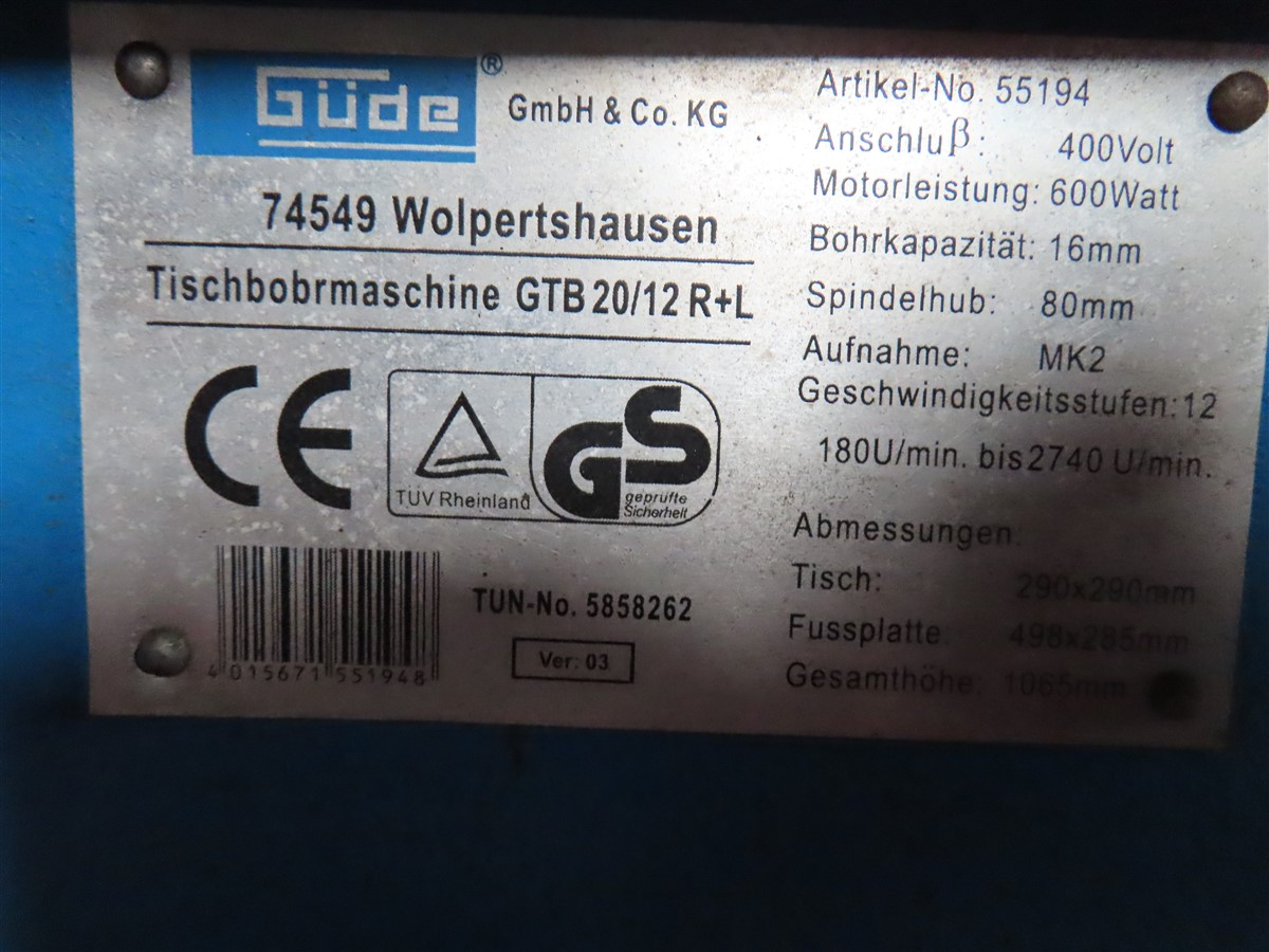 1 Tischbohrmaschine, Fabr.: Güde, Typ: GTB20/12 R+L