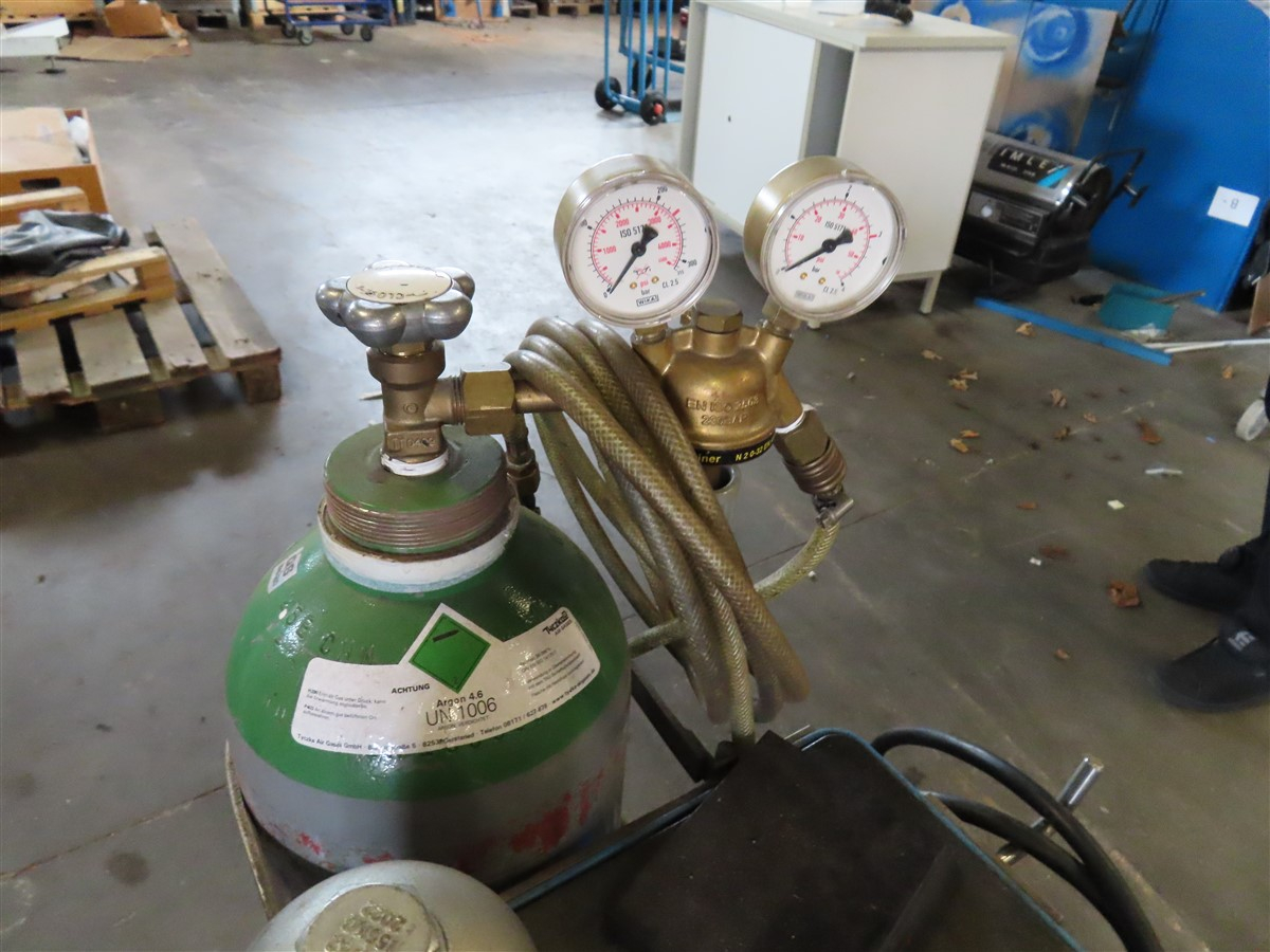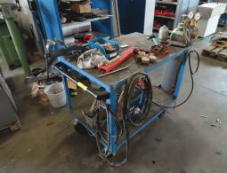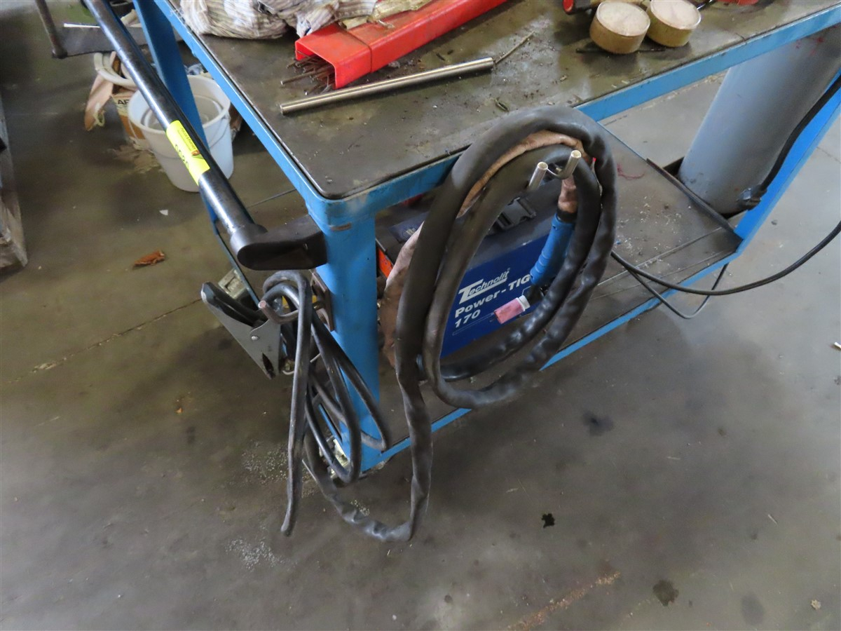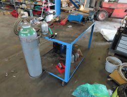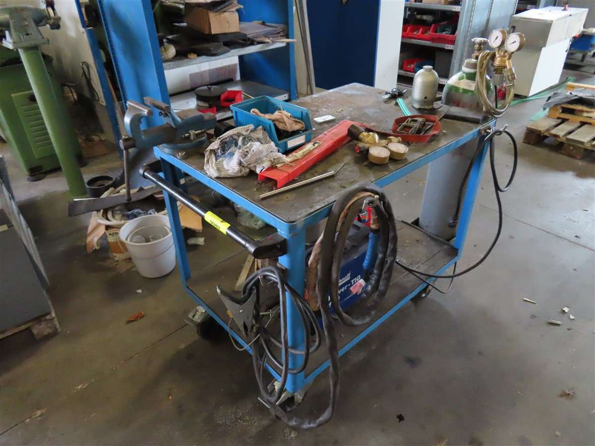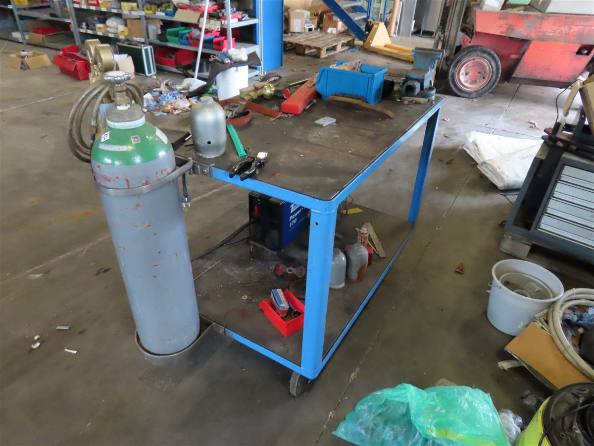 1 Etagentransportwagen, blau mit aufgesetzten Schraubstock und aufgesetzten Migmag Schweißgerät, Fabr.: Technolit, Typ: Power-TIG170