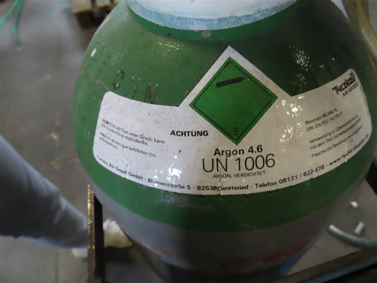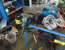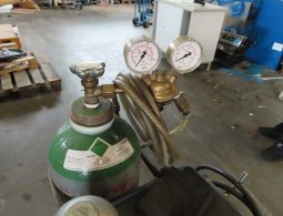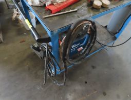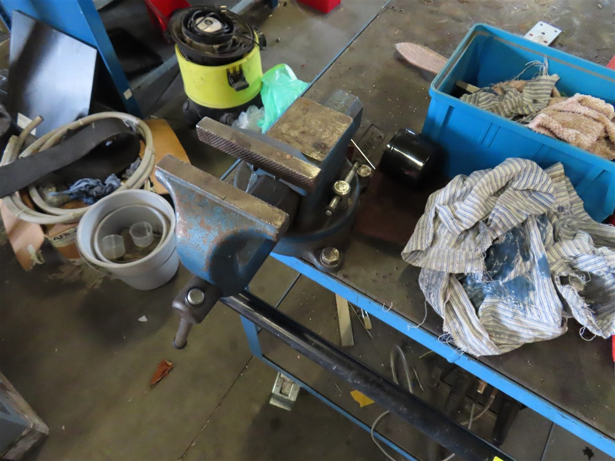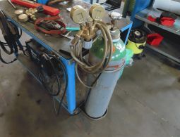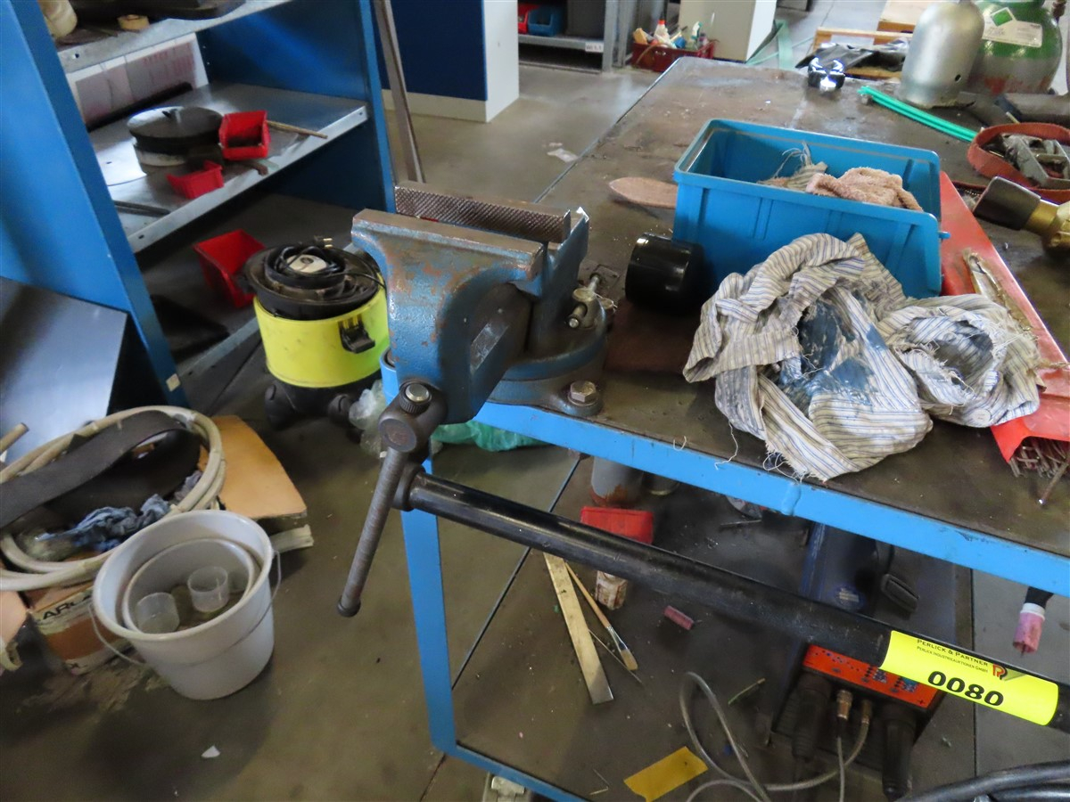 1 Etagentransportwagen, blau mit aufgesetzten Schraubstock und aufgesetzten Migmag Schweißgerät, Fabr.: Technolit, Typ: Power-TIG170