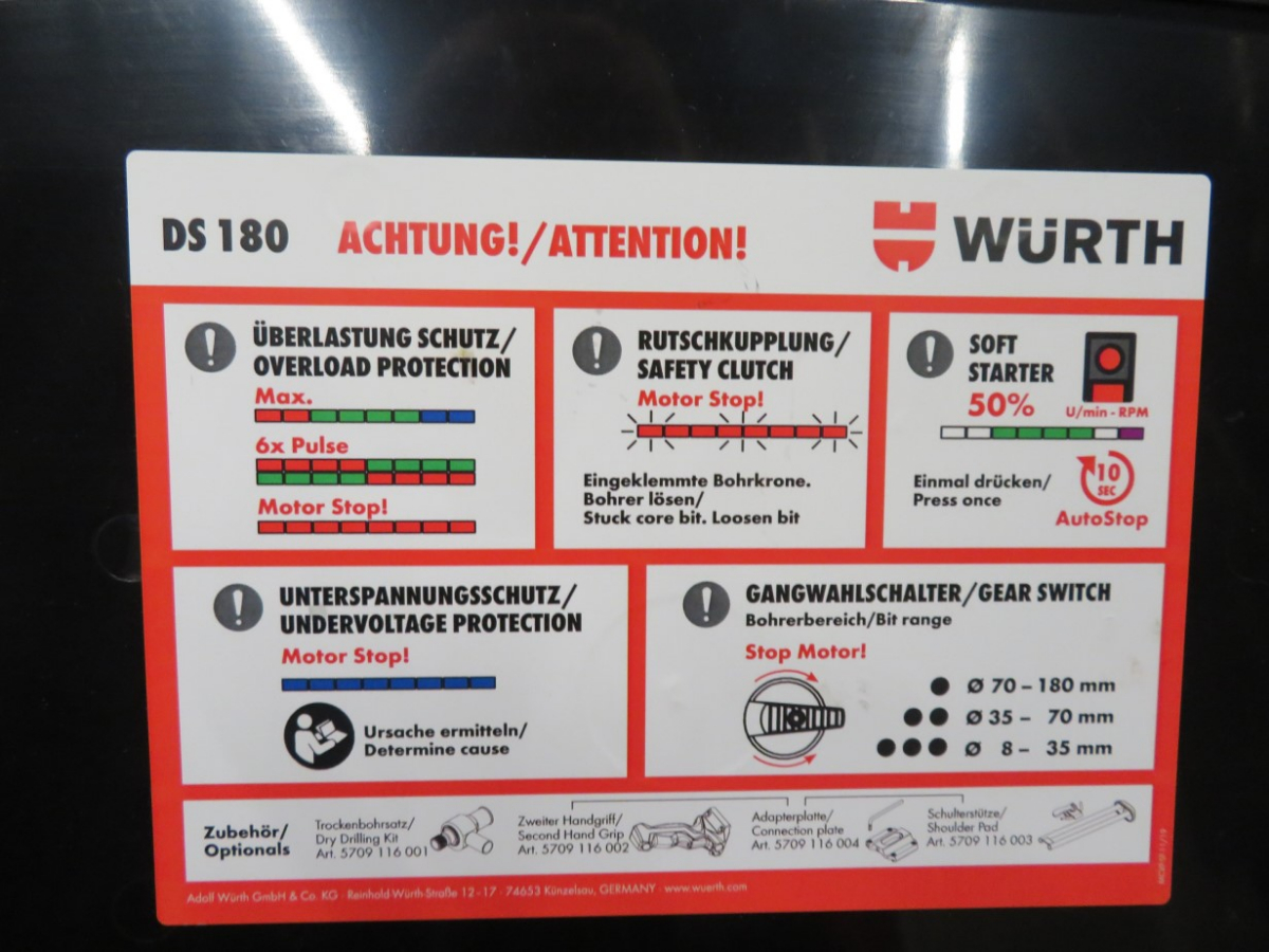1 Kernbohrgerät, Fabr. Würth, Typ DS 180-T, Serien-Nr. 119426512211820566, Baujahr 2021, mit 1 Bohrständer, im Koffer