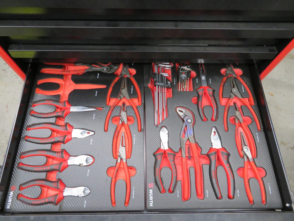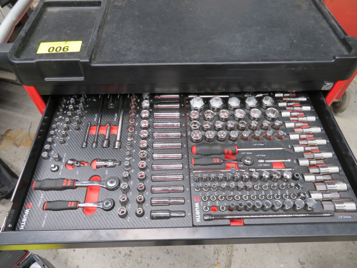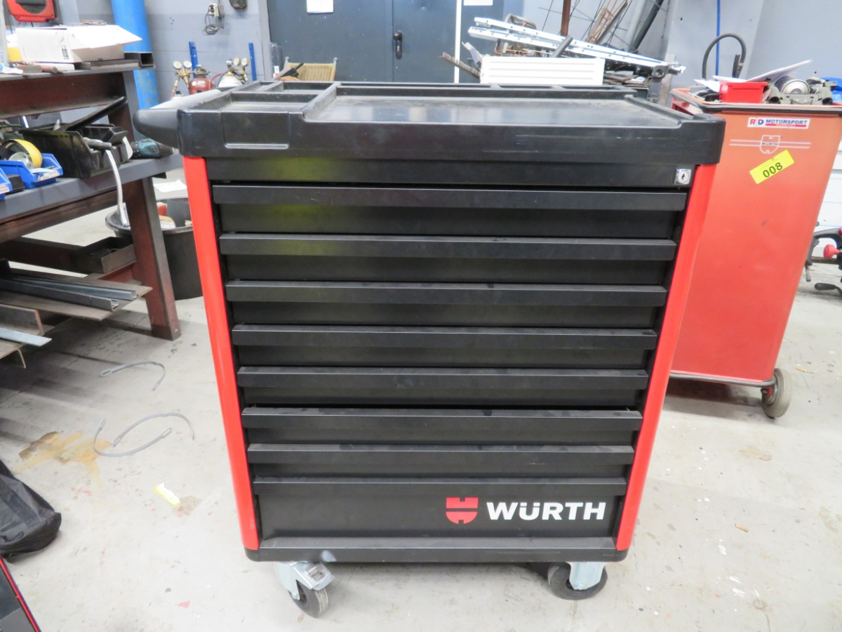 1 Werkstattwagen, Fabr. Würth, Typ Basic 8,8, schwarz/rot, 8 Auszüge, mit 1 Inhalt, bestehend aus: Steckschlüssel-Sätze, Ring- und Maulschlüssel, Schraubendreher, Zangen, Rohrzange, etc. unvollständig