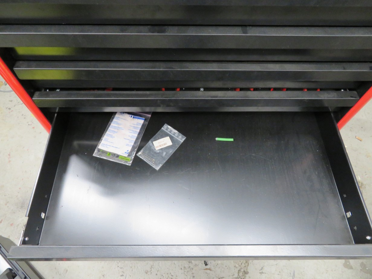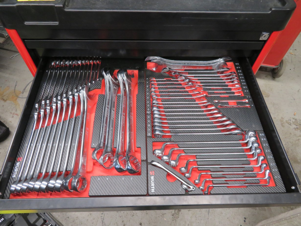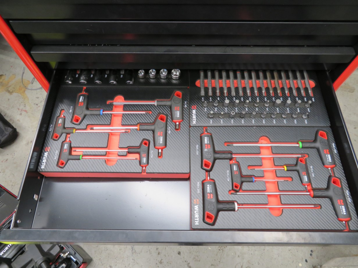 1 Werkstattwagen, Fabr. Würth, Typ Basic 8,8, schwarz/rot, 8 Auszüge, mit 1 Inhalt, bestehend aus: Steckschlüssel-Sätze, Ring- und Maulschlüssel, Schraubendreher, Zangen, Rohrzange, etc. unvollständig