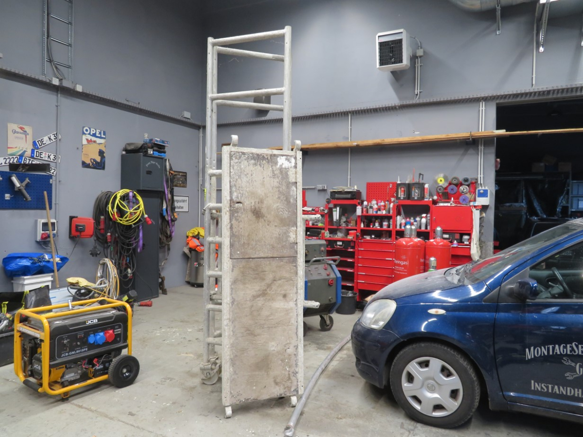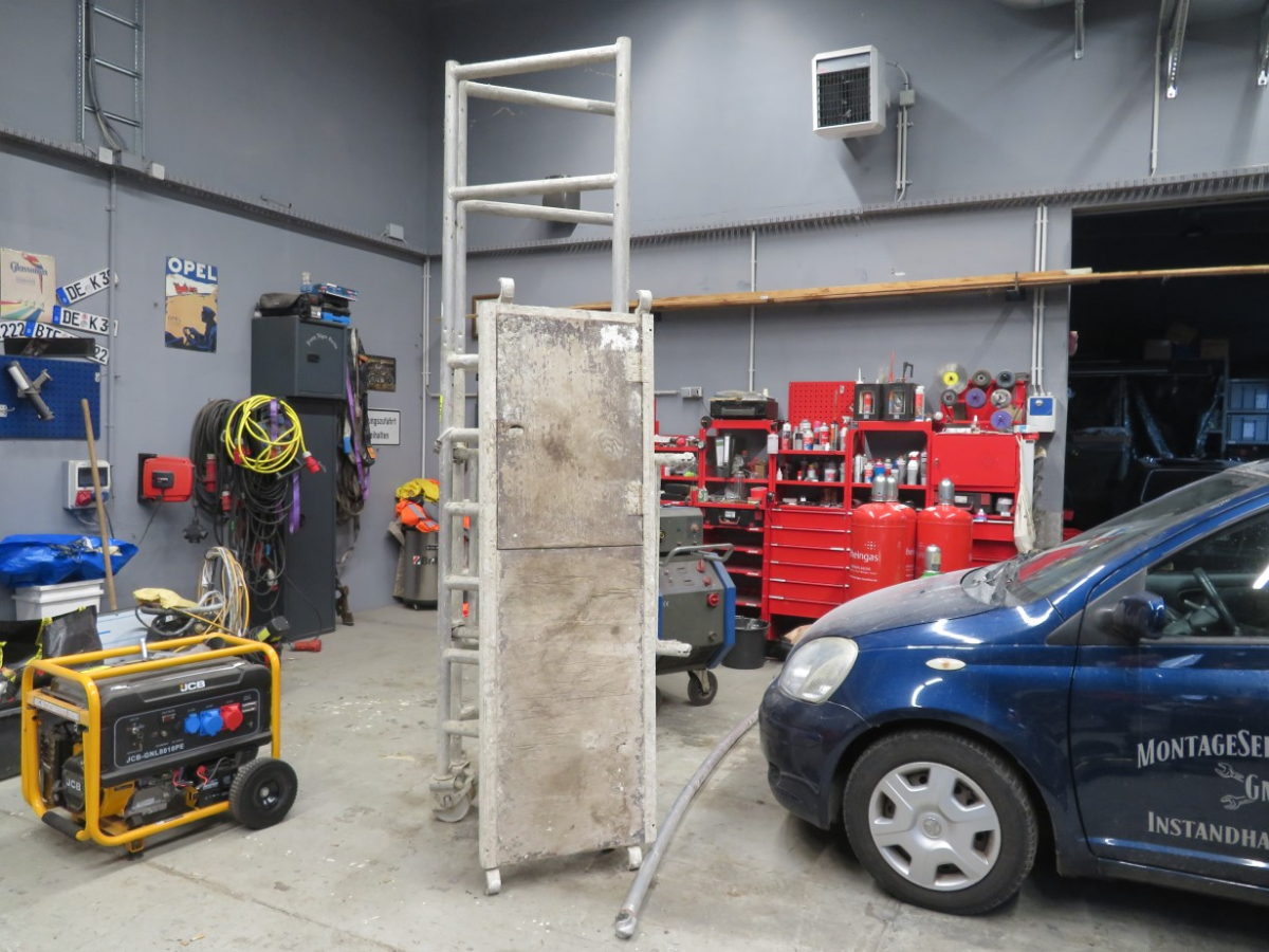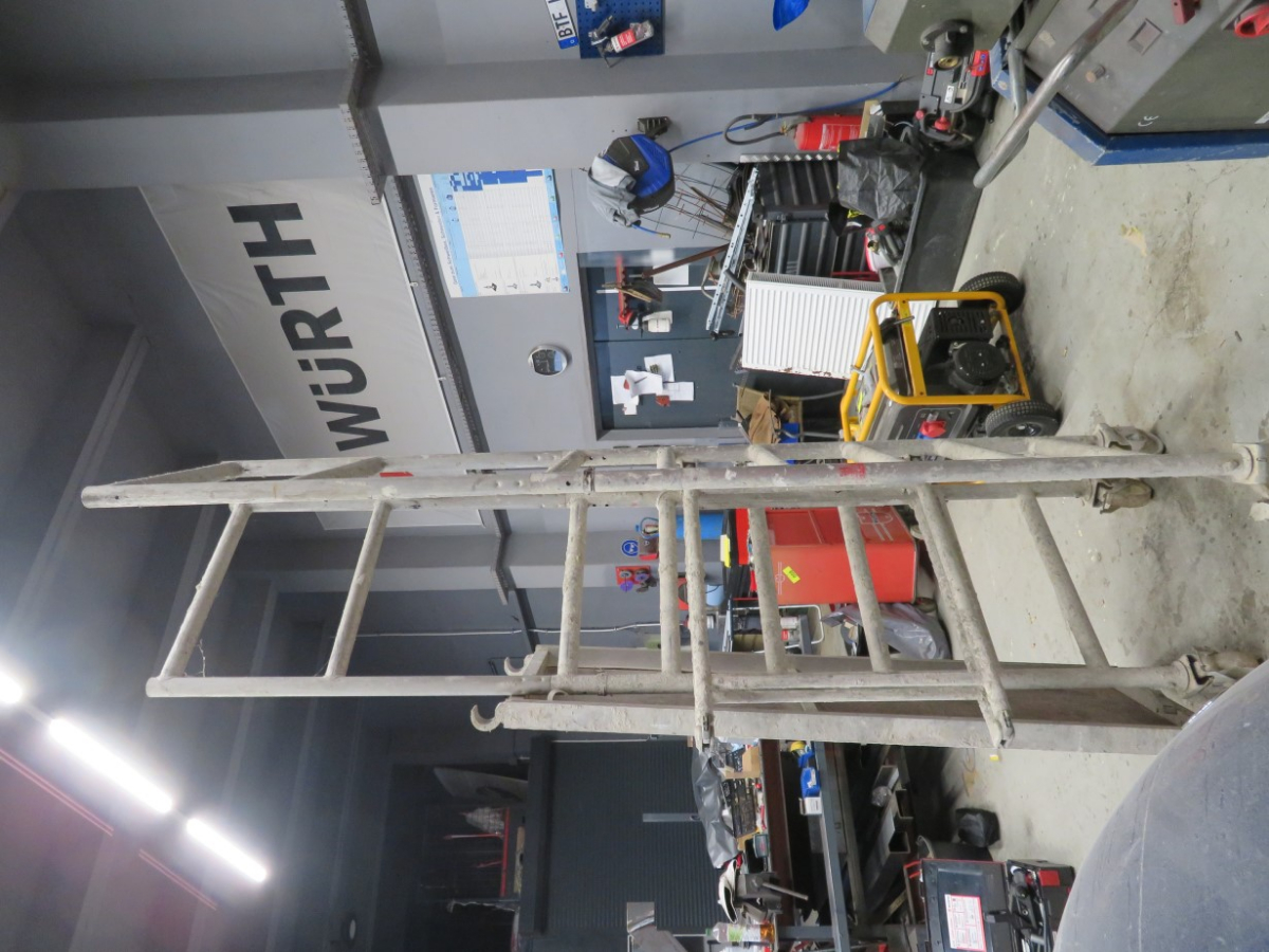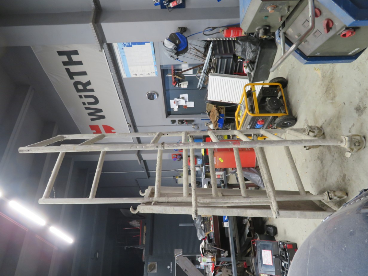 1 Alu Klapp- Faltgerüst, Länge wahrscheinlich ca. 2 m, max. Arbeitshöhe bis ca. 4 m, mit 1 Belagsplatte mit Durchstieg