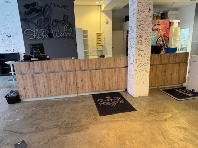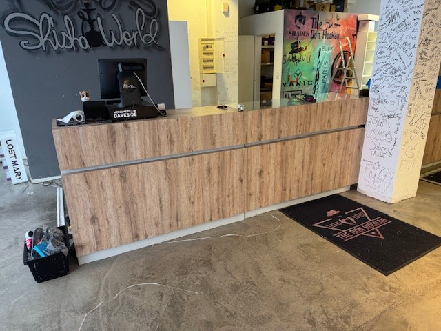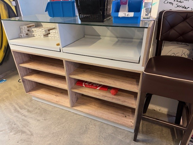 1 Verkaufstresen, 3-teilig, Holzoptik, Glasoberfläche, mit Staufächern und Schubfächer, ca 2 m x 1,3 m pro Teil