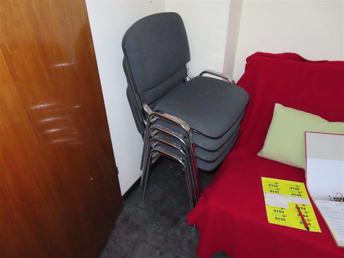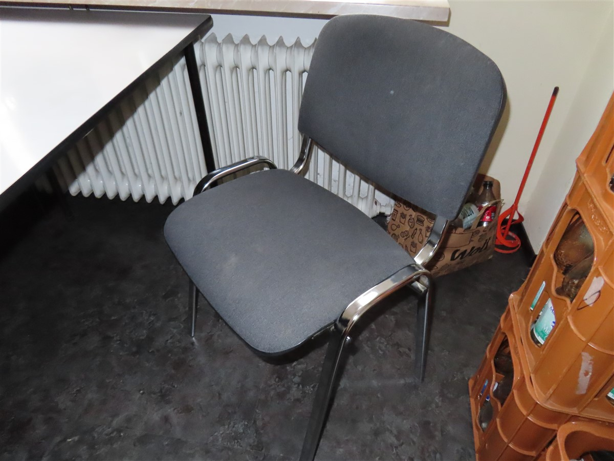 1 Sitzgruppe, bestehend aus 2 x Beistelltisch, weiß, und 8 x Gästestuhl, Stoffbezug grau