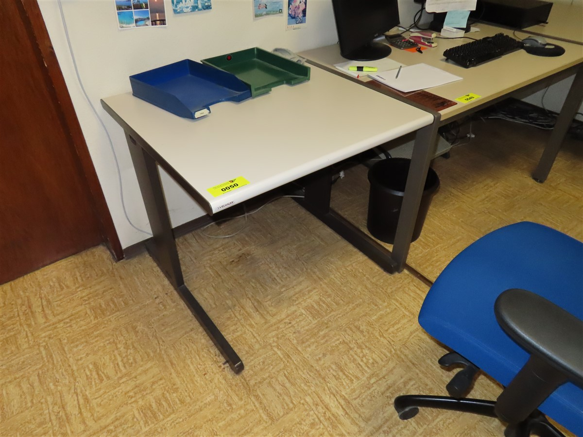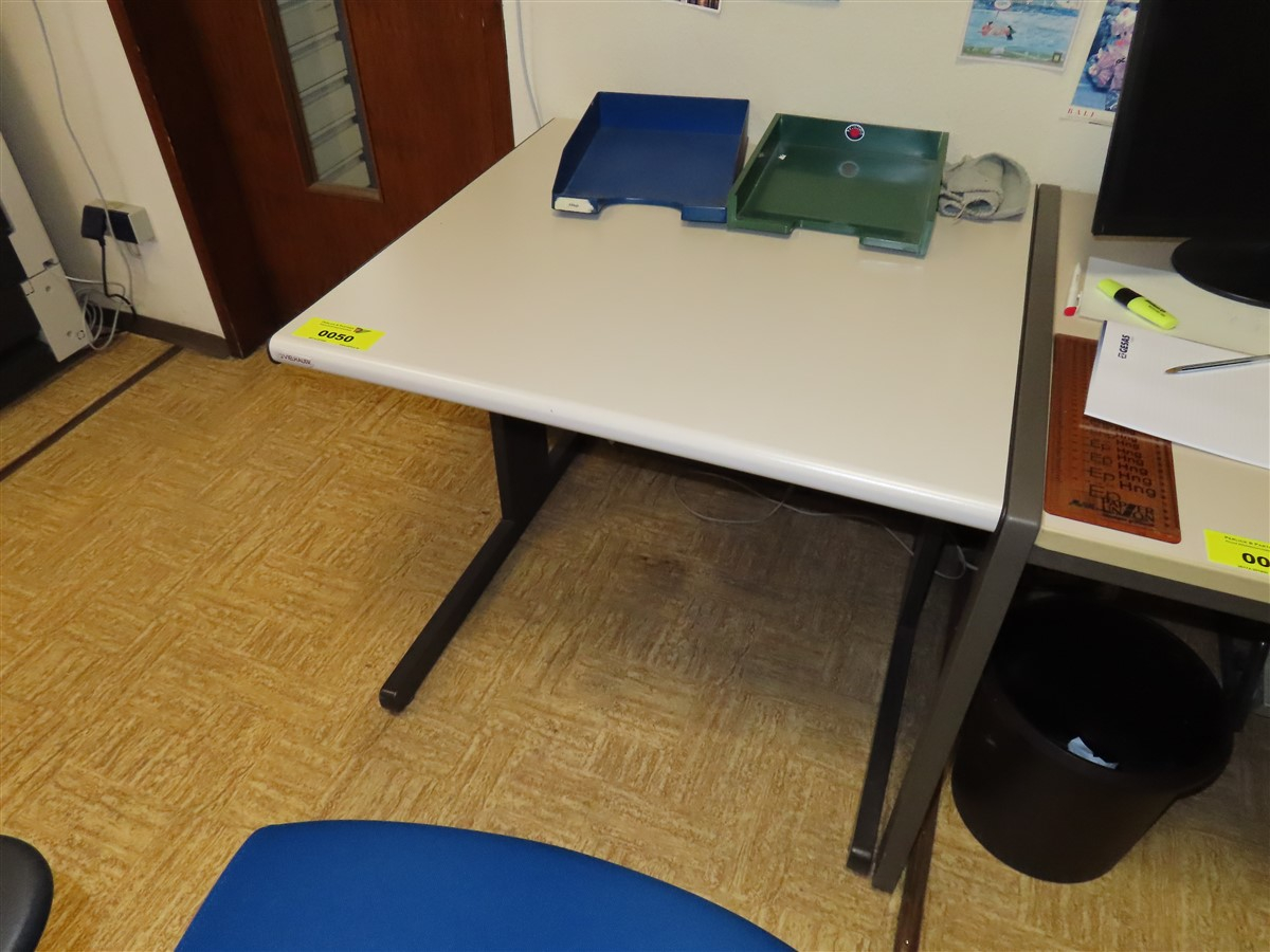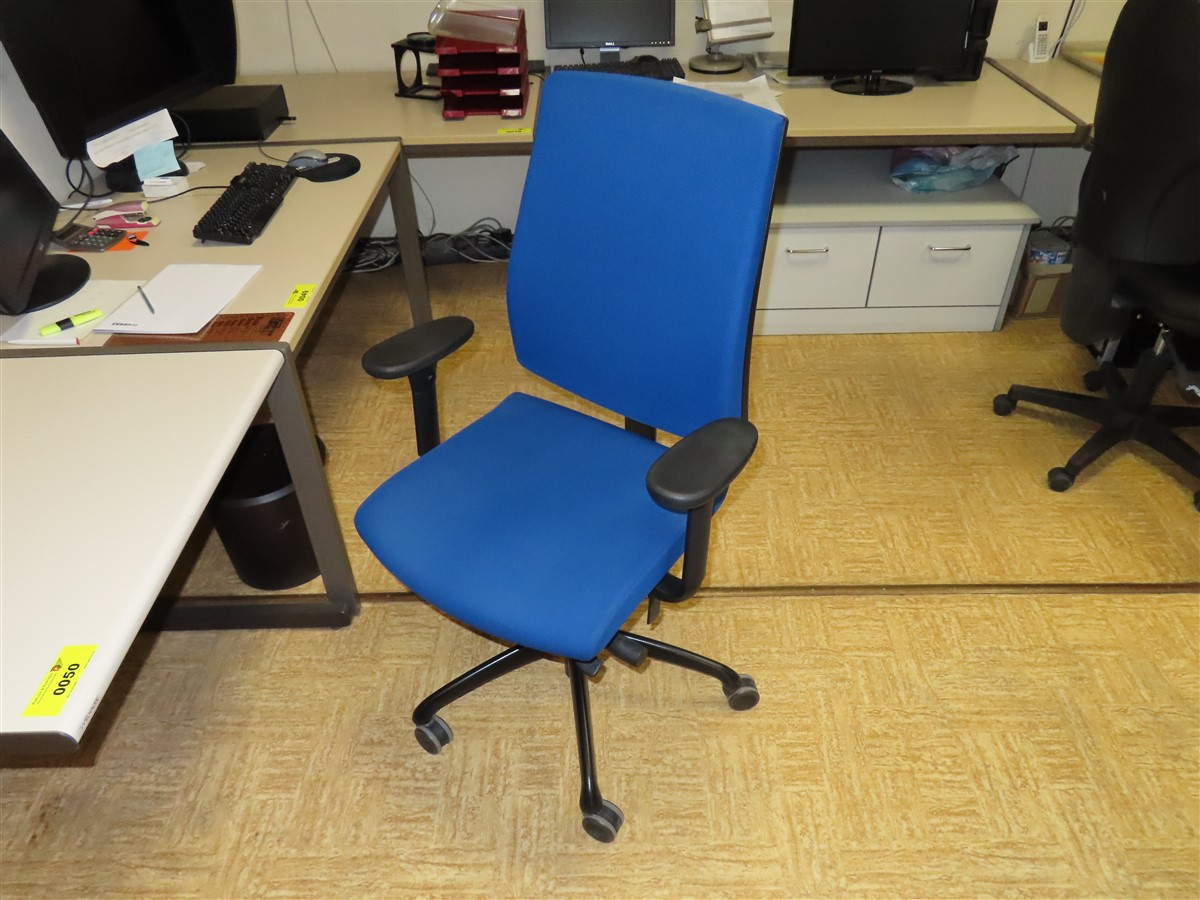 1 Beistelltisch, klein, beige/schwarz, mit 1 x Bürodrehstuhl, blau, Stoffbezug