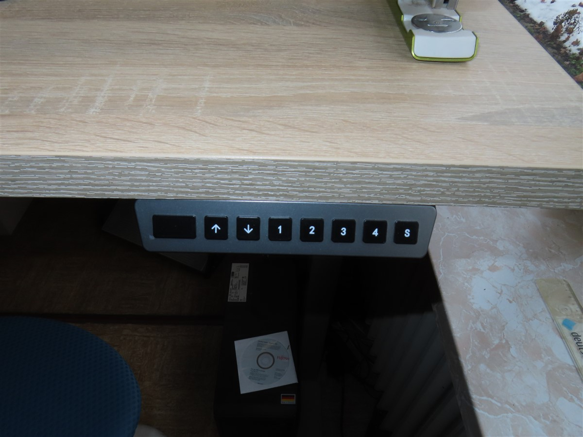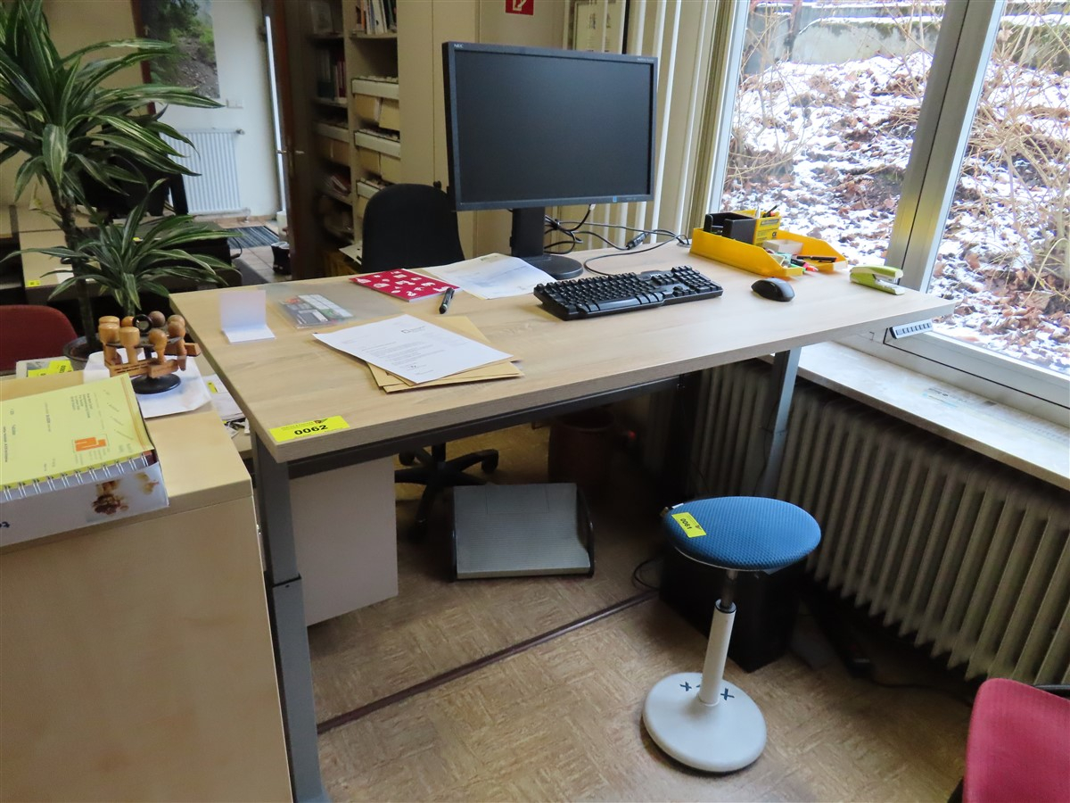 1 Schreibtisch, höhenverstellbar, Holzoptik, mit 1 x Gästestuhl, Stoffbezug rot