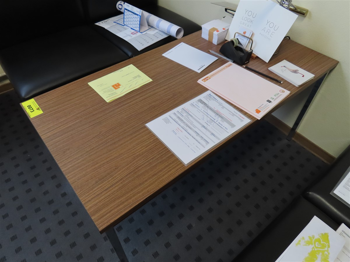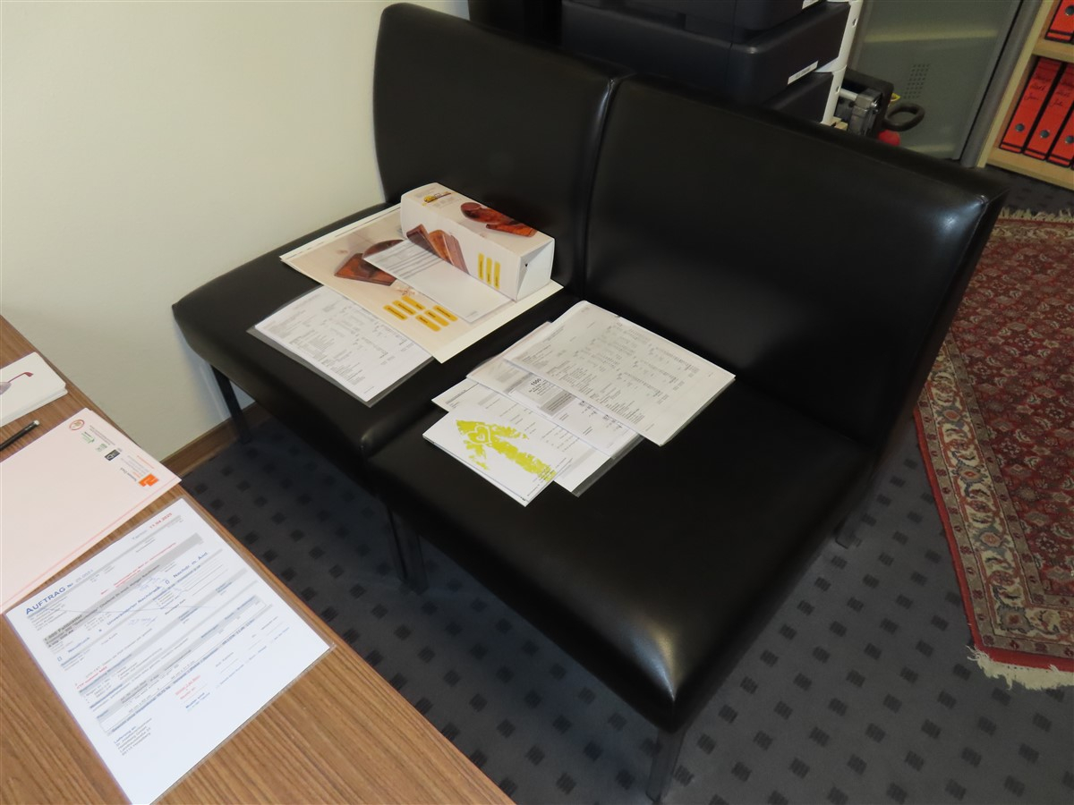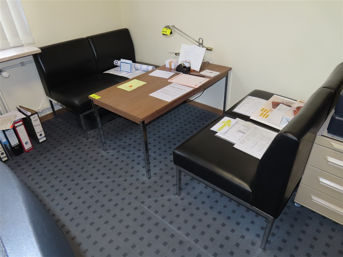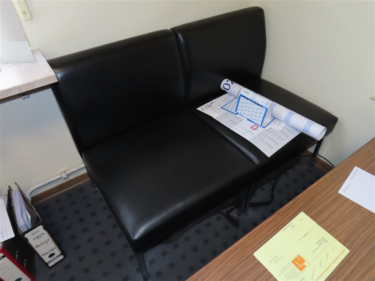 1 Sitzgruppe, bestehend aus 2 x 2-Sitzer, Lederoptik schwarz sowie 1 x Beistelltisch, rechteckig, Holzoptik dunkel